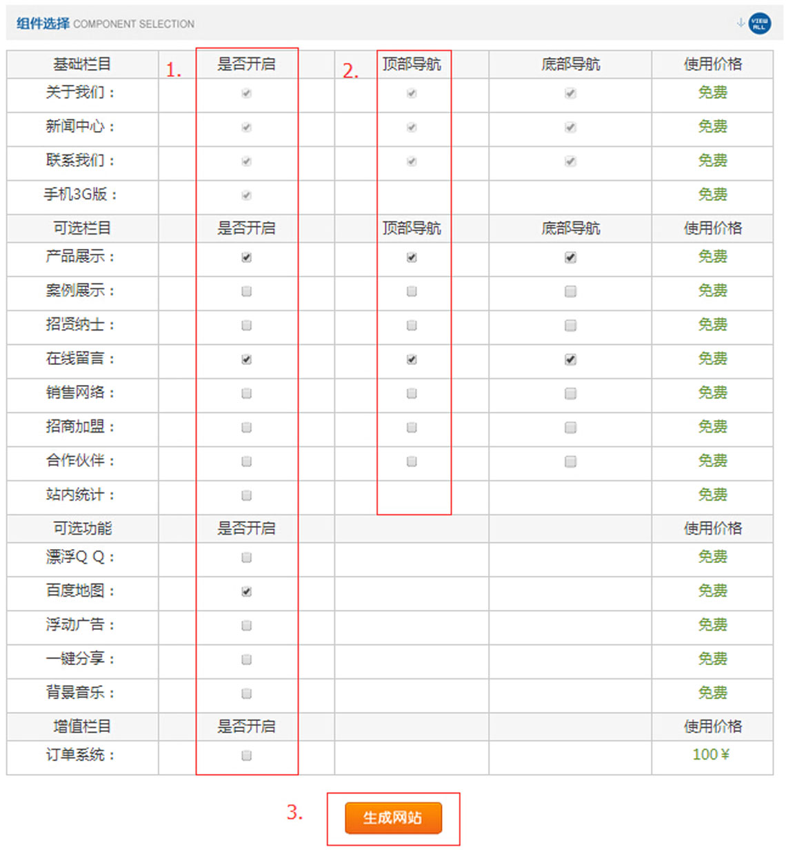 此处为网站栏目的勾选,可在您需要的栏目上打勾。