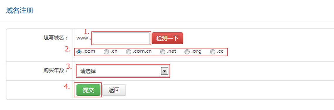4、填写您所要注册的域名格式,可以检测下是否被注册,未被注册就可申请,选择注册购买年限,后点击“提交”;